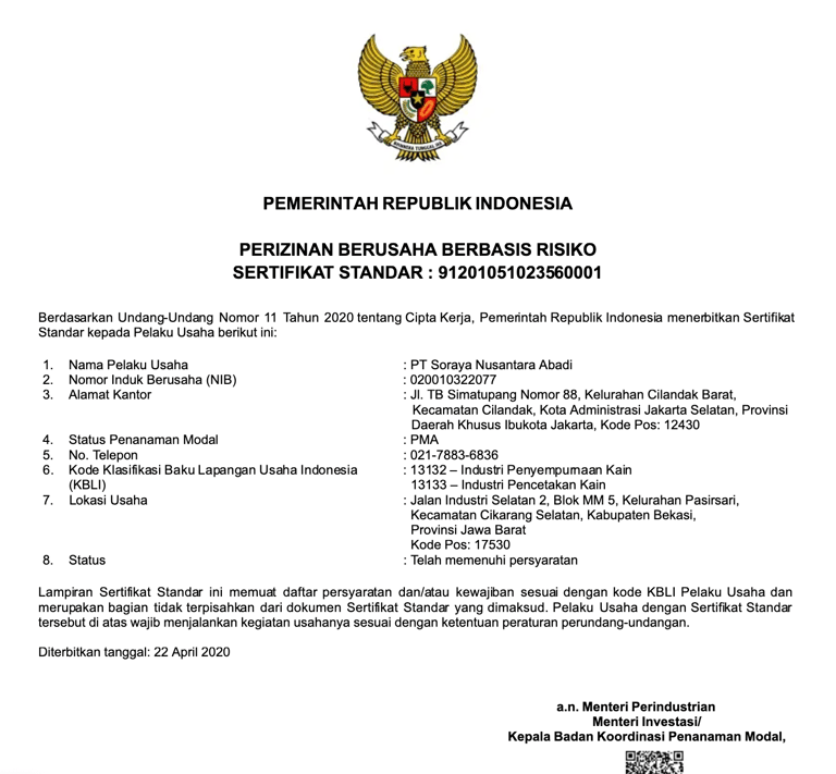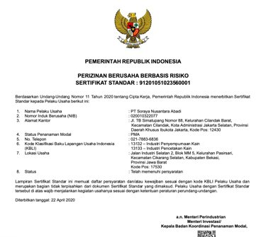 Sertifikat Standar merupakan suatu dokumen perizinan yang di terbitkan oleh sistem OSS (Online Single Submission) berdasarkan tingkat risiko bidang usaha.
